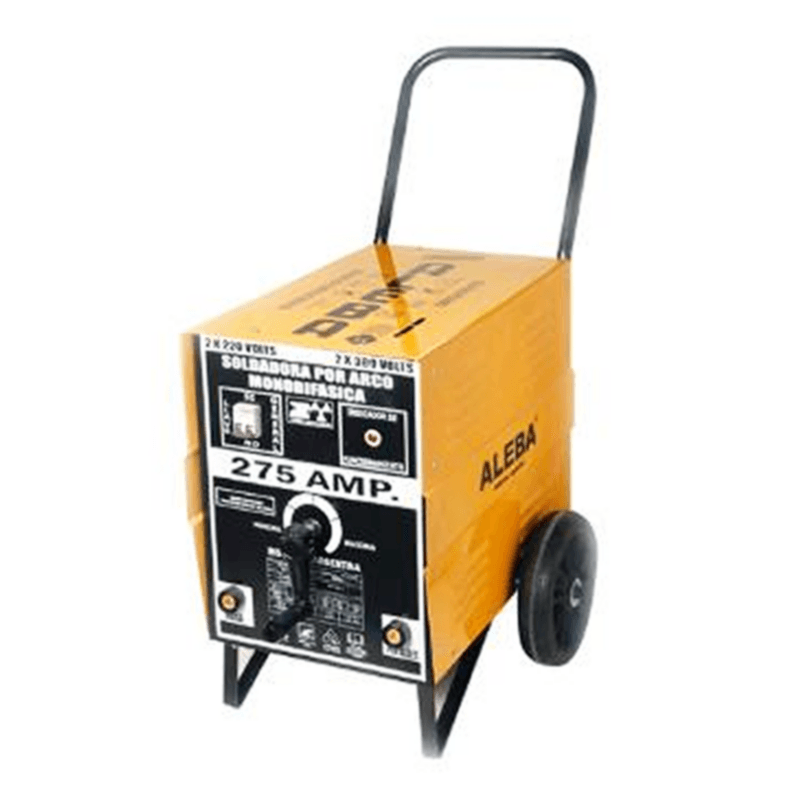 Alimentación 50 ciclos: 2-220 / 2-380v. Potencia absorbida: 9 kw. Tensión en vacío: 55v / 75v. Regulación de amperes: 40-275. Electrodos utilizables en mm: 1,6 a 5. Autonomía de trabajo en amperes: 100% =130 A / 60% = 180 A / 35% = 250 A. Número de regulación: shunt. Ventilación: t urbo. Gabinete: con ruedas. Peso en kgs: 65.