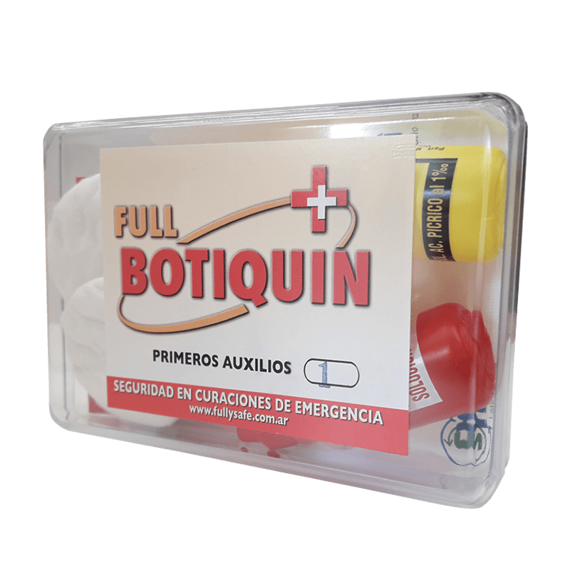 Contenido: 1 agua oxigenada 30cc, 2 apósitos protectores, 2 hisopos, 2 discos de algodón hidrófilo, 1 sobre de gasa hidrófila, 1 bicarbonato 25gr, 1 jabón.