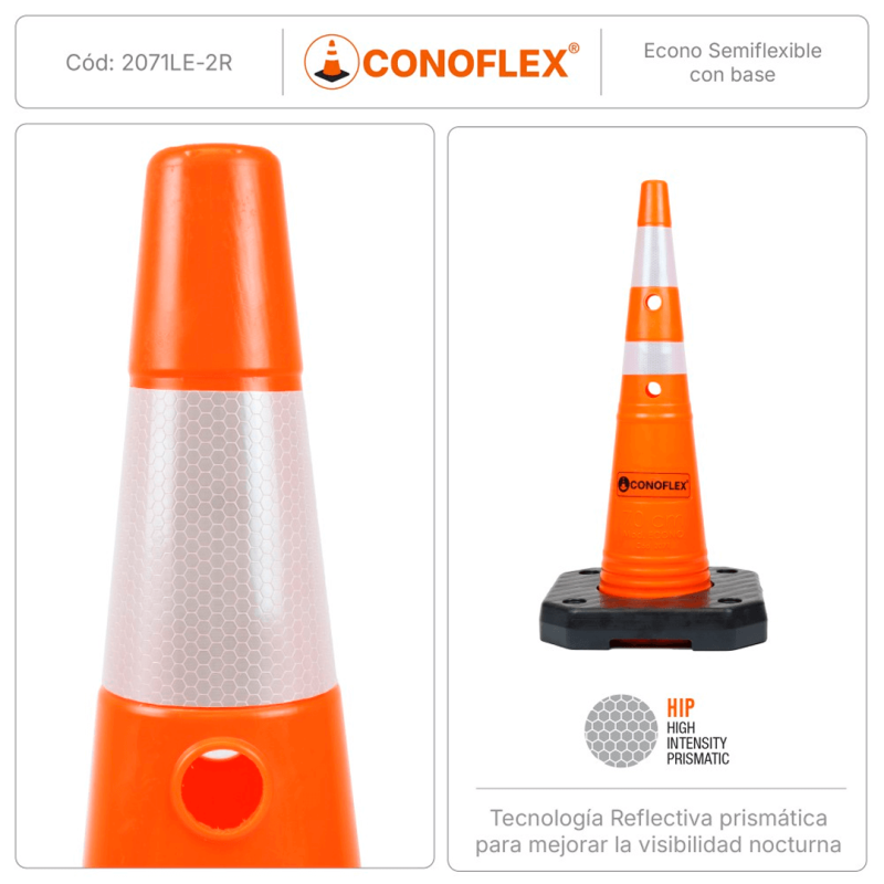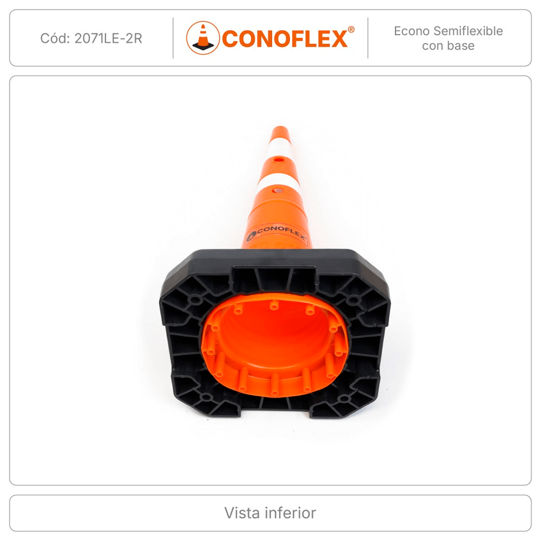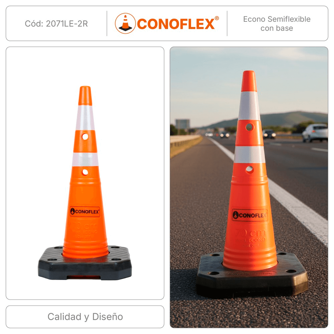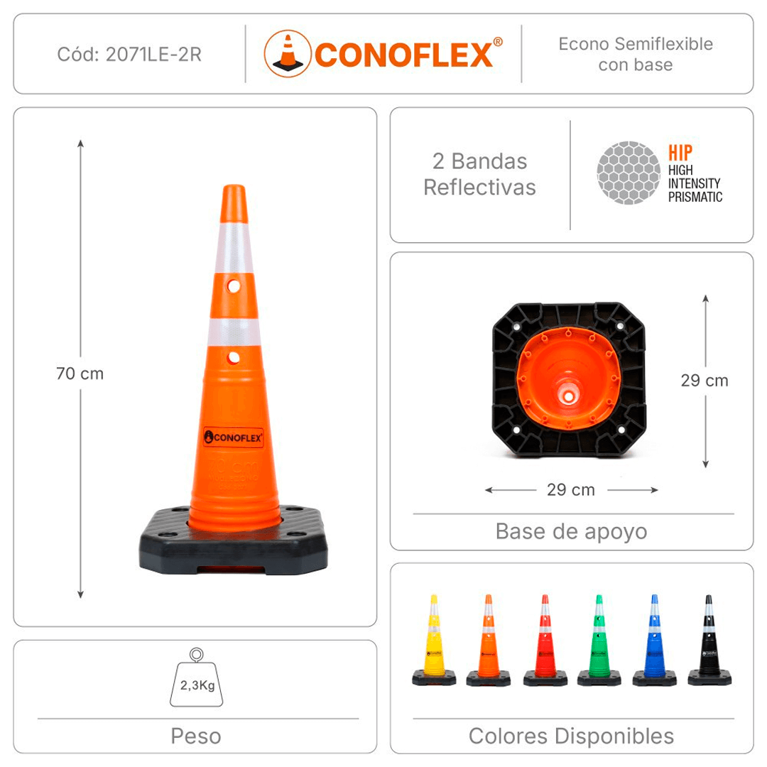 Cono de señalización vial de 70cm de altura, fabricado en material polietileno semiflexible, con aditivo UV para protección solar, garantizando una excelente resistencia frente a las condiciones climáticas severas y la exposición a la intemperie. Conformado en dos piezas, cono y base de contrapeso.