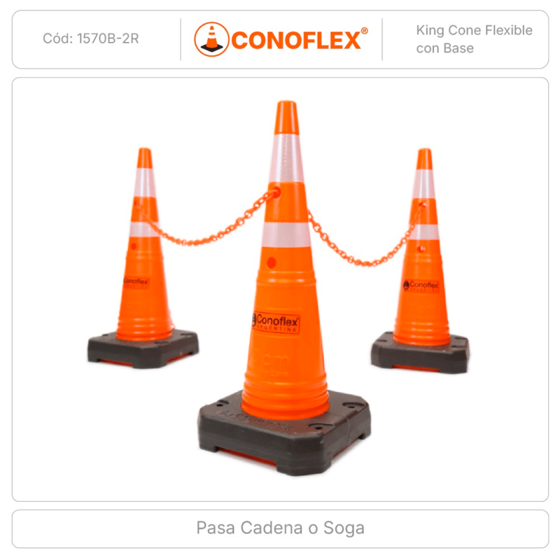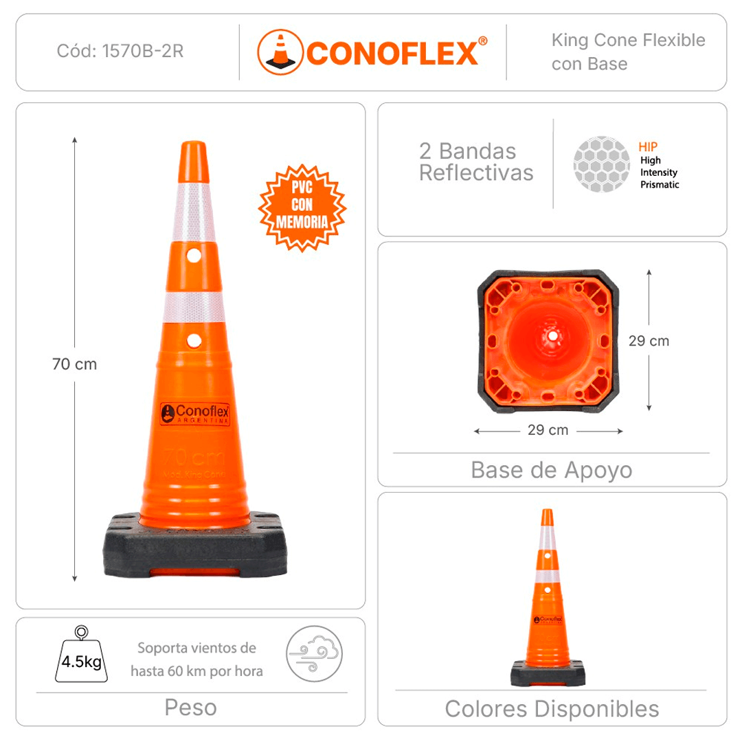 Color naranja vial, dureza 80 shore A, peso 4,5kg ± 0,2kg con filtro UV para protección solar. El diámetro mayor del cono es de 20cm y 4cm en su diámetro menor. Cuenta con 2 perforaciones de Ø 2,5cm de diámetro para pasar cadenas plásticas o cintas perimetrales. Presenta 2 bandas reflectivas, una de 10cm y otra de 5cm de ancho, con características HIP (High Intensity Prismatic) según normas IRAM ASTM D4956 Tipo-3. Las mismas se encuentran bajo relieve de 0,5cm para su mayor protección. Base de contrapeso antideslizante reforzada de 29 x 29cm. Con 4 orificios de Ø 1,5cm de diámetro para su anclaje al suelo.