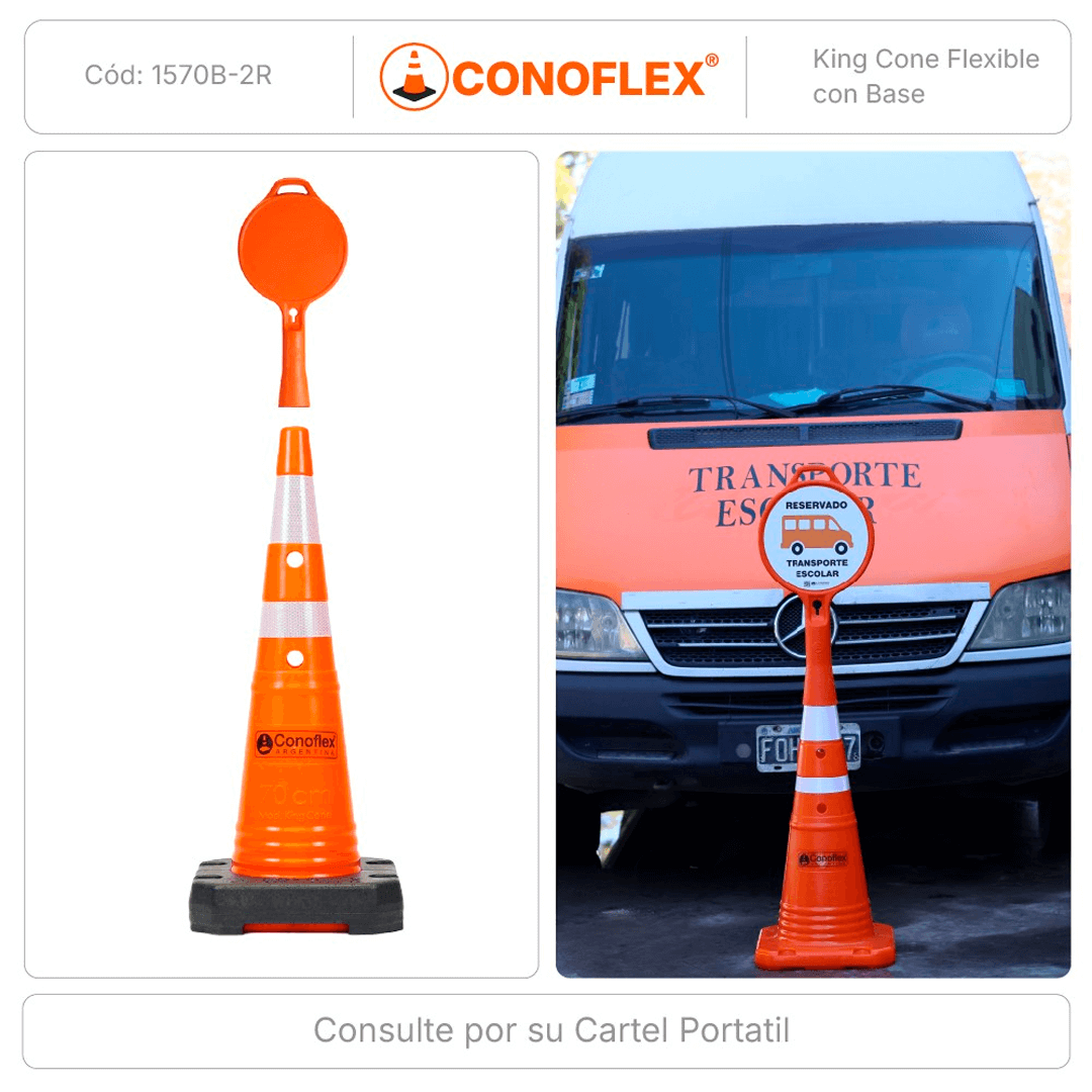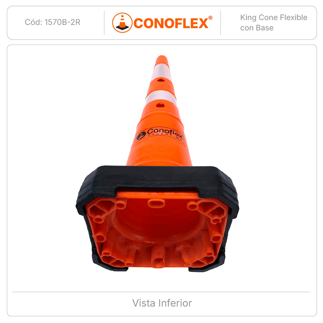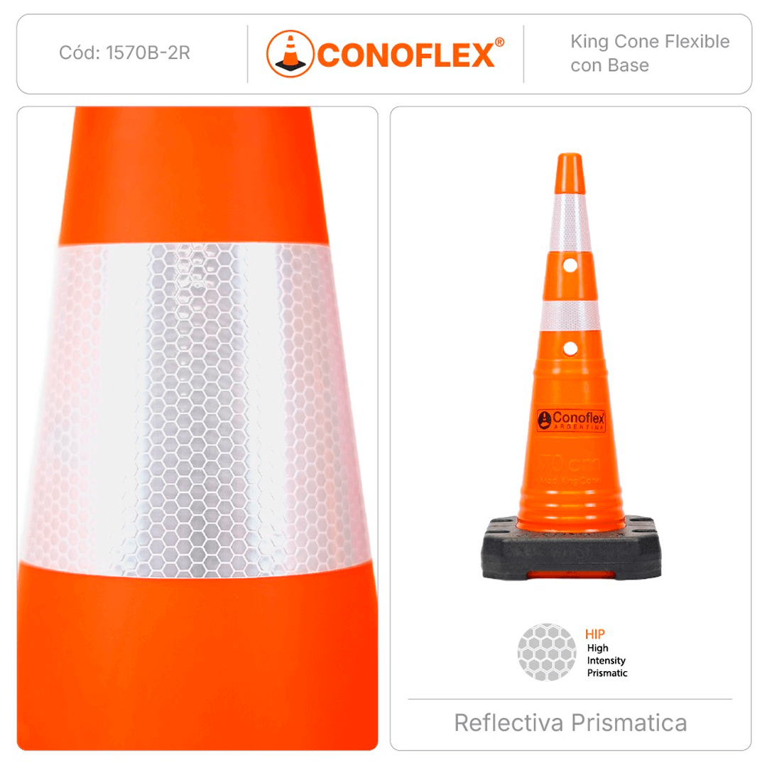Cono de señalización vial de 70cm de altura, fabricado en dos piezas de PVC flexible con memoria.
