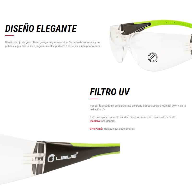 Diseñado para proteger el ojo contra golpes, impacto de partículas, polvo y chispas. Protección frontal y lateral. Diseño ojo de gato, elegante y económico. Su radio de curvatura, y las patillas siguiendo la línea, logran un calce perfecto a la cara y visión panorámica. Lentes y patillas de policarbonato. Filtro UV. Tornillo de acero inoxidable.