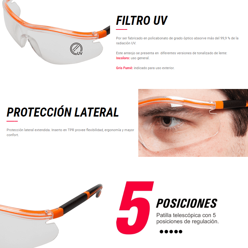 Diseñado para proteger el ojo contra golpes, impacto de partículas, polvo y chispas.