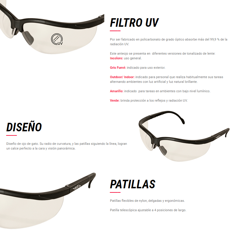 Diseño ojo de gato. Su radio de curvatura, y las patillas siguiendo la línea, logran un calce perfecto a la cara y visión panorámica.