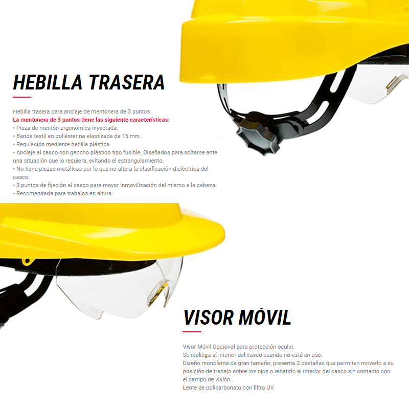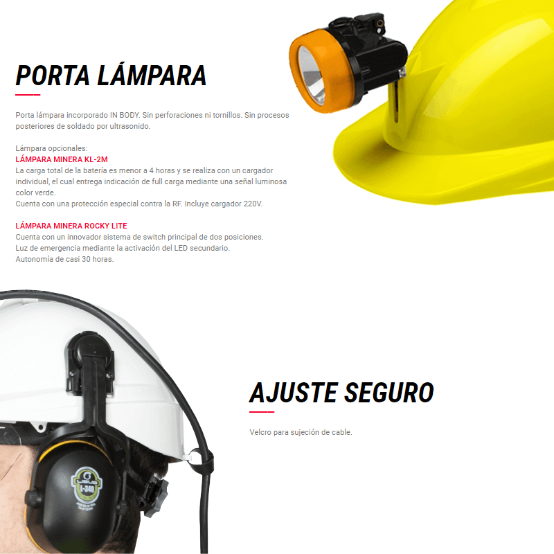Diseño modular que permite el montaje de productos de protección facial, auditiva, ocular y soldadura. Fabricado en polietileno, se distingue por su moderno diseño y excelente terminación. Hebilla trasera para anclaje de mentonera de 3 puntos. Visera frontal de 3,5cm que permite una óptima visión superior manteniendo las prestaciones de seguridad. Sin ventilación. No incluye arnés. Con soporte para lámpara minera.