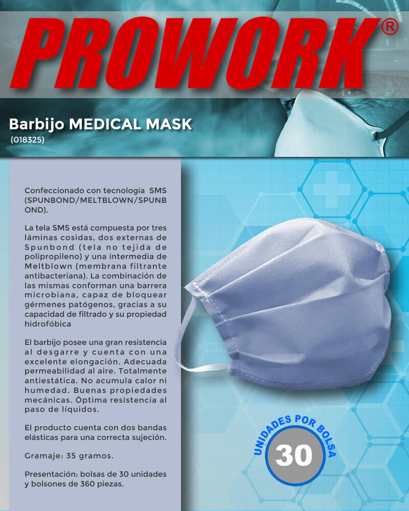 La tela SMS está compuesta por tres láminas cosidas, dos externas de Spunbond (tela no tejida de polipropileno) y una intermedia de Meltblown (membrana filtrante antibacteriana). La combinación de las mismas conforman una barrera microbiana, capaz de bloquear gérmenes patógenos, gracias a su capacidad de filtrado y su propiedad hidrofóbica. El barbijo posee una gran resistencia al desgarre y cuenta con una excelente elongación. Adecuada permeabilidad al aire. Totalmente antiestática. No acumula calor ni humedad. Buenas propiedades mecánicas. Óptima resistencia al paso de líquidos. El producto cuenta con dos bandas elásticas para una correcta sujeción. Gramaje: 35 gramos. Presentación: bolsas de 30 unidades y bolsones de 360 piezas.